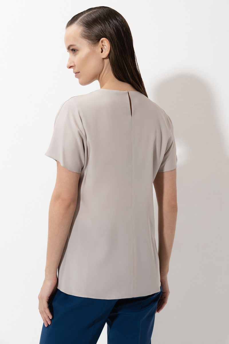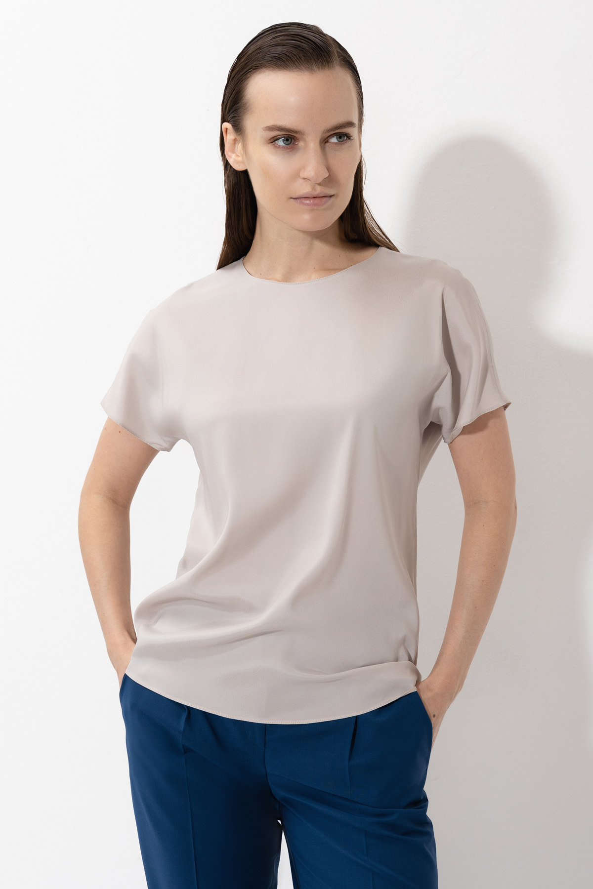 Loose-fitting blouse with one-piece sleeves. The basic model, embellished with delicate shine of the fabric, will fit into any wardrobe.