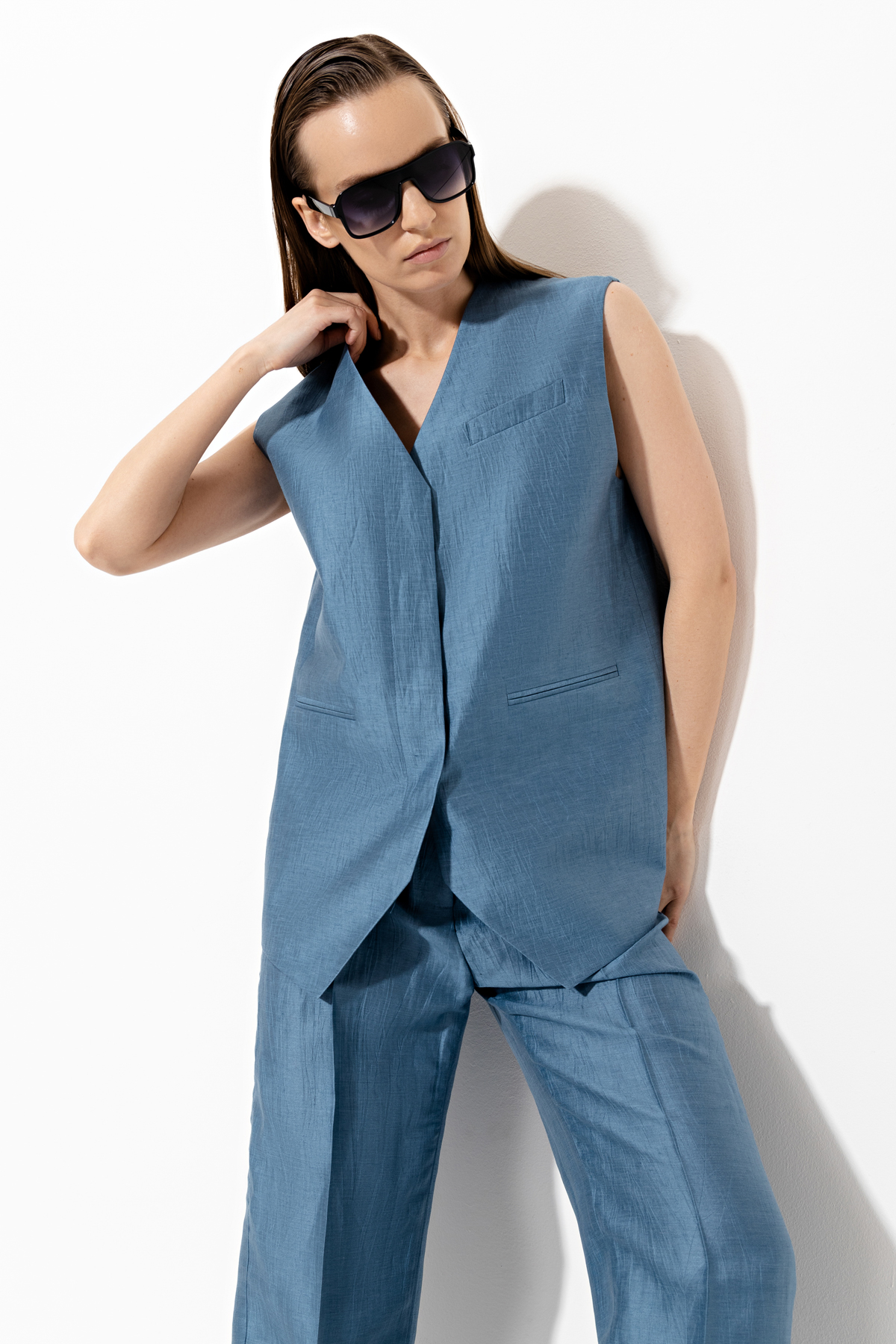 Long vest with a loose fit, made of linen-based blended material. It has a concealed clasp.